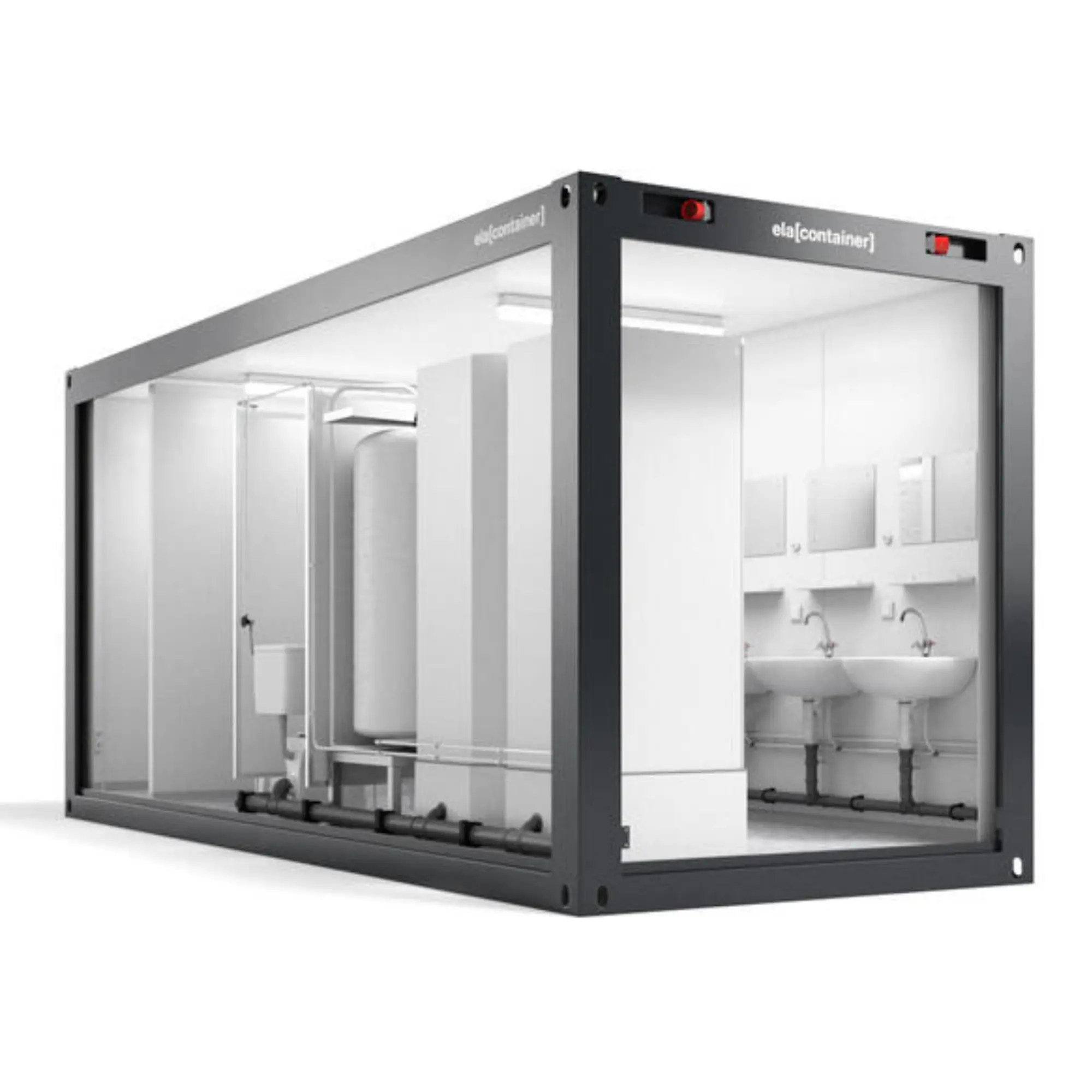 Раковины с высококачественной фурнитурой и зеркалами дополняют широкие возможности санитарного контейнера ELA. Удобные умывальники легко моются, что обеспечивает постоянную чистоту в санитарных помещениях.