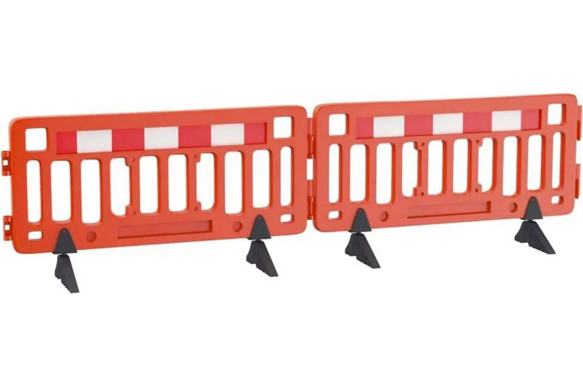 Ограждение дорожное «Баррикада» 2м изготовлено из пластика, по бокам предусмотрены перемычки для скрепления нескольких секций в единое ограждение. Цвет: ярко оранжевый. На одной стороне изделия красно-белая наклейка. Ставится на поворотные ножки из пластика.