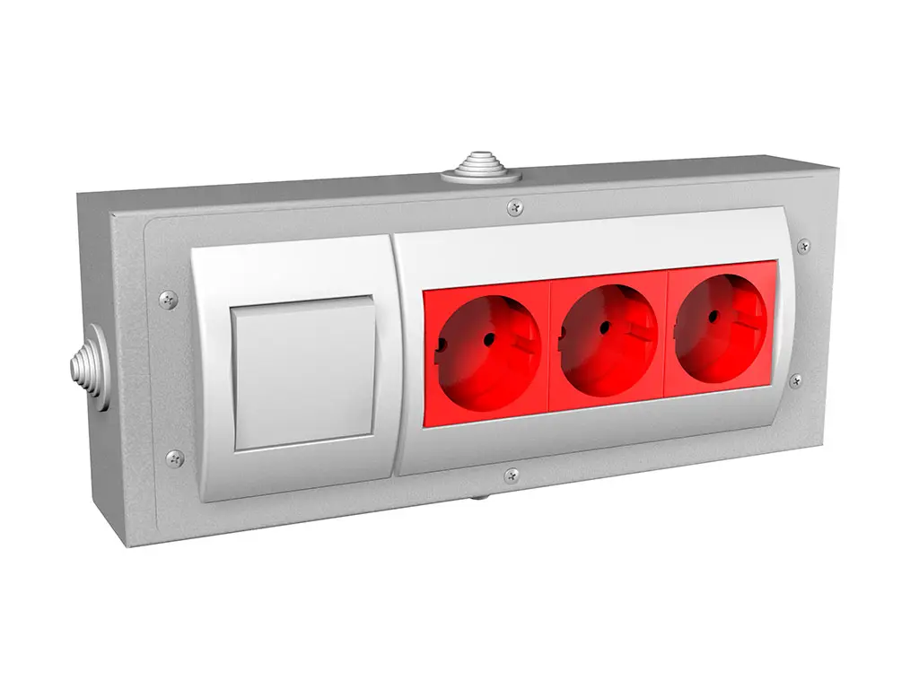 3 розетки 220 В с защитными шторками ( установочным размером 45х45) 1 выключатель одноклавишный (установочным размером 45х45) по боковым сторонам сделаны отверстия (4шт) под 20мм гофрошланг для подвода электропроводки отверстия заглушены резиновыми заглушками блок изготовлен из стали 0,6 мм