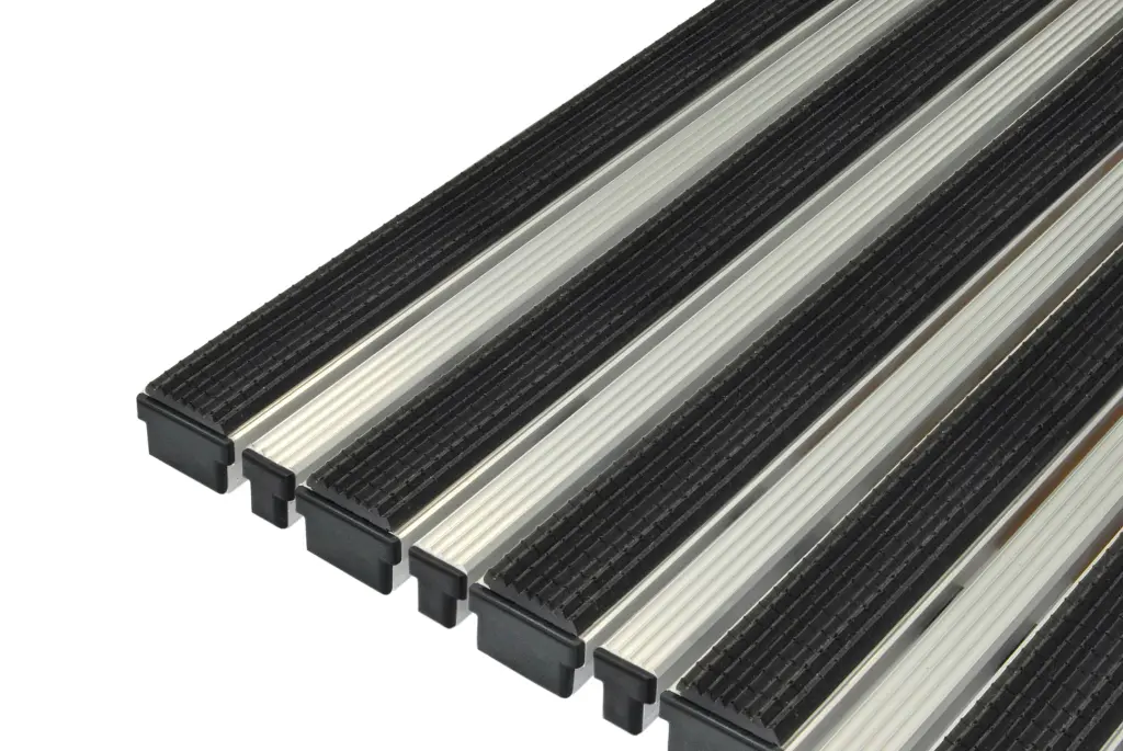 Грязезащитная система состоит из алюминиевой решетки со скребками и вставок из резины. Изделие служит для очистки обуви от грязи и пыли. Сокращает риск падения на скользких мраморных, гранитных, бетонных покрытиях в осенне-зимний период. Все изделия имеют межпрофильные вставки из резины, которые также выполняют роль амортизирующих элементов, что значительно снижает шумы и скольжение изделия при прохождении посетителей.