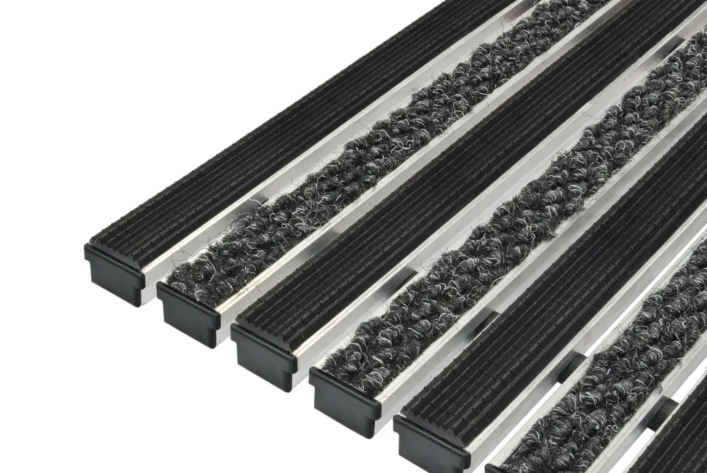 Грязезащитная система состоит из алюминиевой решетки со скребками и вставок из текстиля или резины. Изделие служит для очистки обуви от грязи и пыли. Сокращает риск падения на скользких мраморных, гранитных, бетонных покрытиях в осенне-зимний период. Все изделия имеют межпрофильные вставки из резины, которые также выполняют роль амортизирующих элементов, что значительно снижает шумы и скольжение изделия при прохождении посетителей.