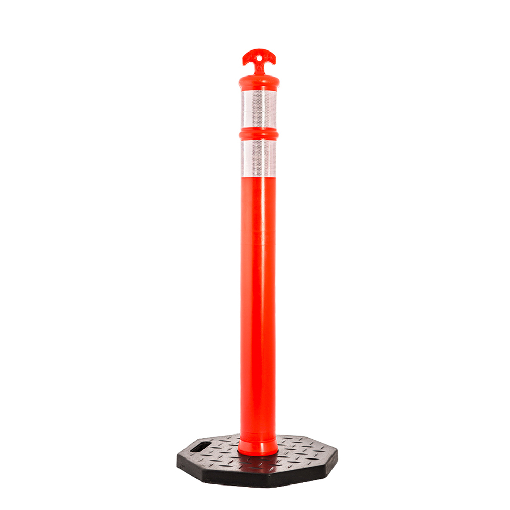 Столбик круглого сечения из красного пластика с нанесенными светоотражающими полосами белого цвета. В верхней части столба имеется колпак для присоединения цепи, фонаря или информационной таблички. Основа - тяжелая, резиновая, круглая подставка. Подставка надевается на изделие сверху и надежно фиксируется в нижней части.