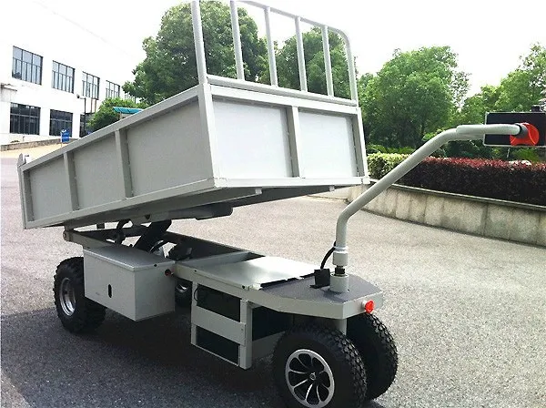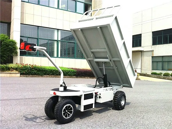 Электрическая тележка с функцией электрической разгрузки кузова, идеально подходит как для работы в помещениях, так и для наружных работ. Функция электрической разгрузки особенно актуальна для тяжелых грузов. Грузоподъемность тележки составляет 800кг. Время полного подъема кузова примерно 15 секунд. Кузов поднимается на угол 45 градусов.
