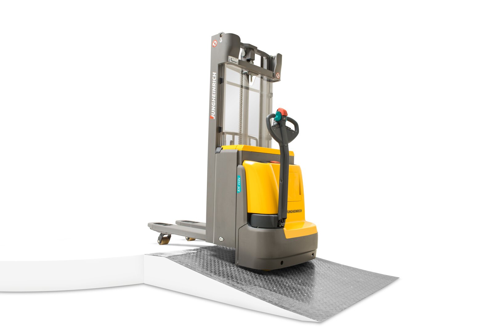 Маневренные и гибко используемые штабелеры EJC 112z отличаются высокой универсальностью. Благодаря дополнительному подъему опорных лап они имеют более высокий дорожный просвет, что позволяет им быстро и легко преодолевать значительные неровности покрытия, пороги и рампы. В качестве опции механизм подъема опорных лап может использоваться для одновременной транспортировки двух палет. Механизмы подъема опорных лап и вил работают при этом независимо друг от друга. Благодаря компактным габаритам EJC 112z сохраняет маневренность в условиях ограниченного пространства. Пропорциональный гидравлический привод обеспечивает плавное и точное штабелирование даже тяжелых грузов. Это предотвращает повреждение груза, а также штабелера и инфраструктуры склада. Питание двигателей переменного тока осуществляется от долговечных аккумуляторных батарей, которые легко и быстро заряжаются благодаря встроенному зарядному устройству.