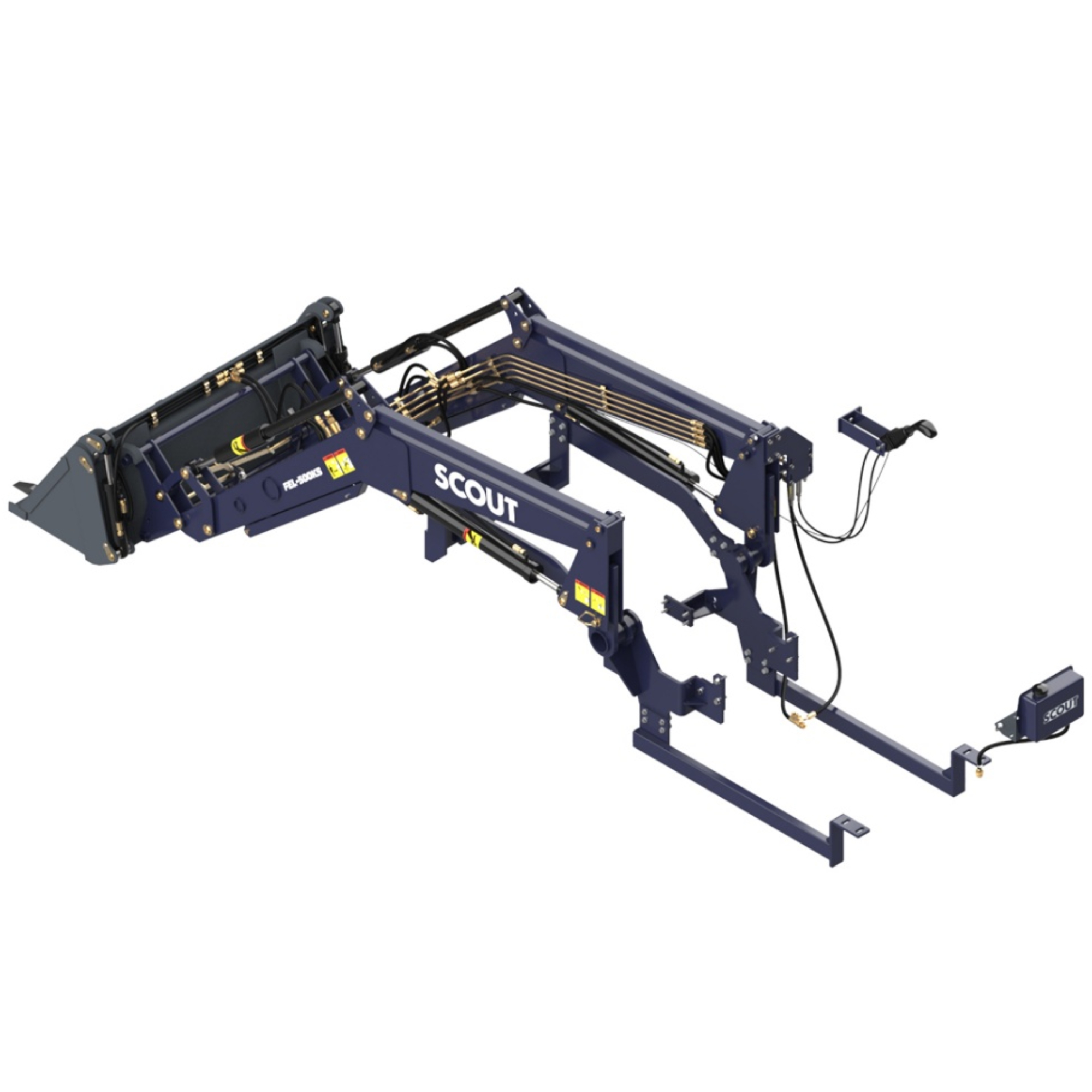 В стандартную комплектацию погрузчика-еврорамки СКАУТ FEL-500KS входит конструкция погрузчика, челюстной ковш, гидравлическая система, джойстиковое управление.