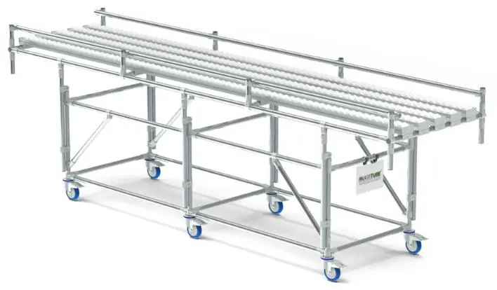 Гравитационный роликовый конвейер ГРК-7 укомплектован роликовыми дорожками шириной 72 мм. Он оснащен дополнительной трубкой спереди и сзади, что позволяет регулировать угол наклона и высоту конвейера, и легко подключаться к другим роликовым конвейерам или рабочим столам.
