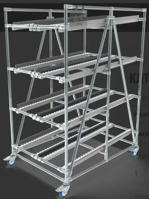 Стеллаж состоит из вертикального каркаса, выполненного из нержавеющей трубы диаметром 28 мм, на котором располагаются полки или уровни с роликовыми дорожками. Роликовые дорожки располагаются под углом, что обеспечивает движение ящиков благодаря силе тяжести. Поскольку товары для упаковки или отгрузки перемещаются автоматически под действием тяжести, работники могут быстрее обрабатывать заказы, не тратя время на манипуляции с грузами. Гравитационные стеллажи позволяют максимально использовать вертикальное пространство склада. Это особенно полезно в условиях ограниченной площади.