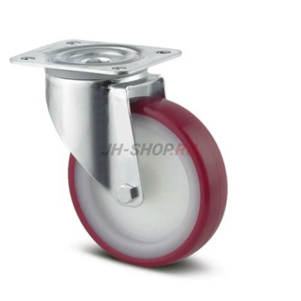 Поворотный ролик, кронштейн из прессованной стали, блестящее оцинкованное пассивированное голубым покрытие, двойной шарикоподшипник в поворотном узле, ось колеса на болту, пыльник, крепежная панель.