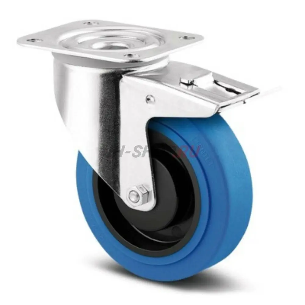 Поворотный ролик с общим тормозом "позадиидущий", кронштейн из прессованной стали, блестящее оцинкованное пассивированное голубым покрытие, двойной шарикоподшипник в поворотном узле, ось колеса на болту, пыльник, крепежная панель.