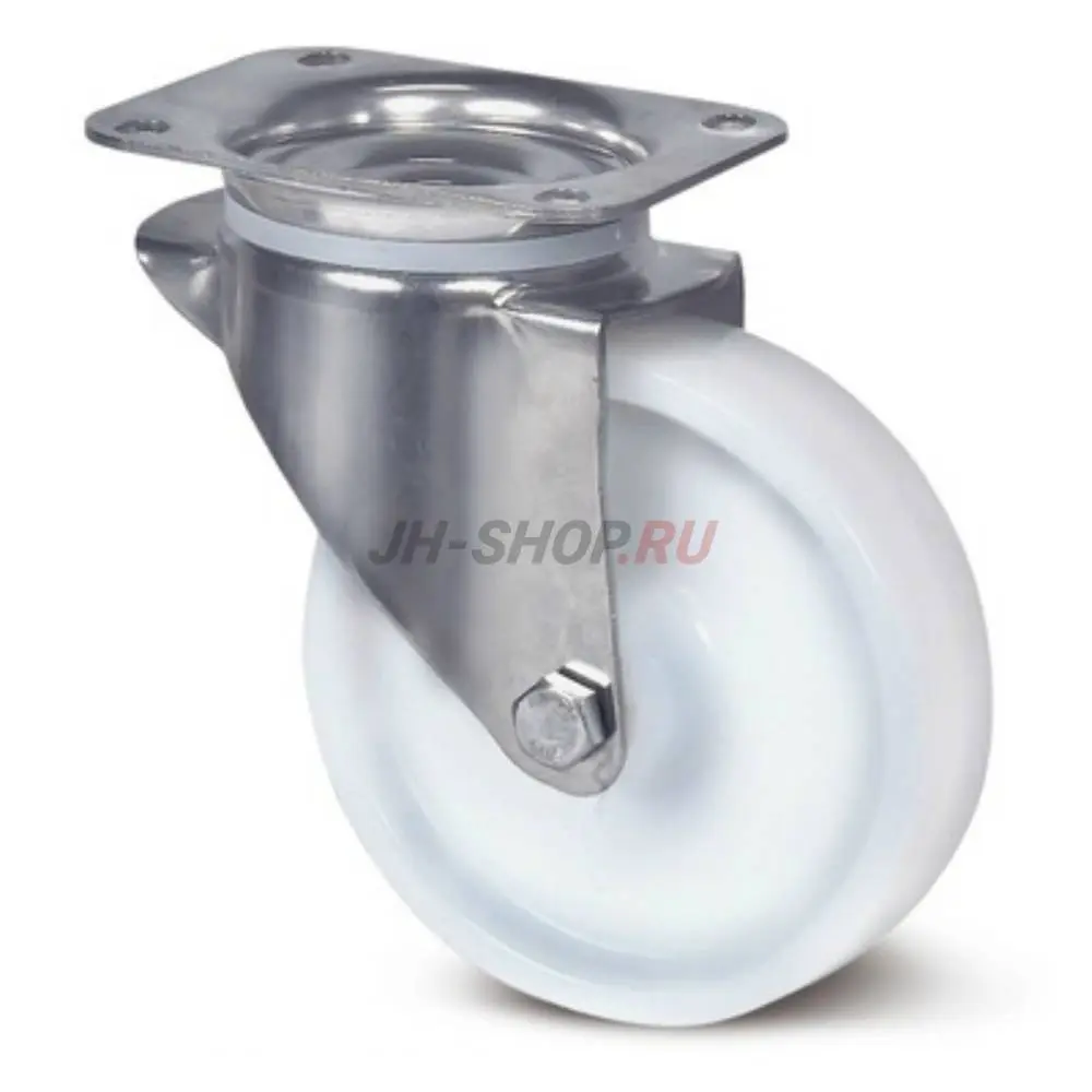 Поворотный ролик, кронштейн изготовлен из Нержавеющей Стали, поворотная головка на двойном шарикоподшипнике, ось колеса на болту, крепежная панель. Центр колеса из Полиамида, подшипник скольжения.