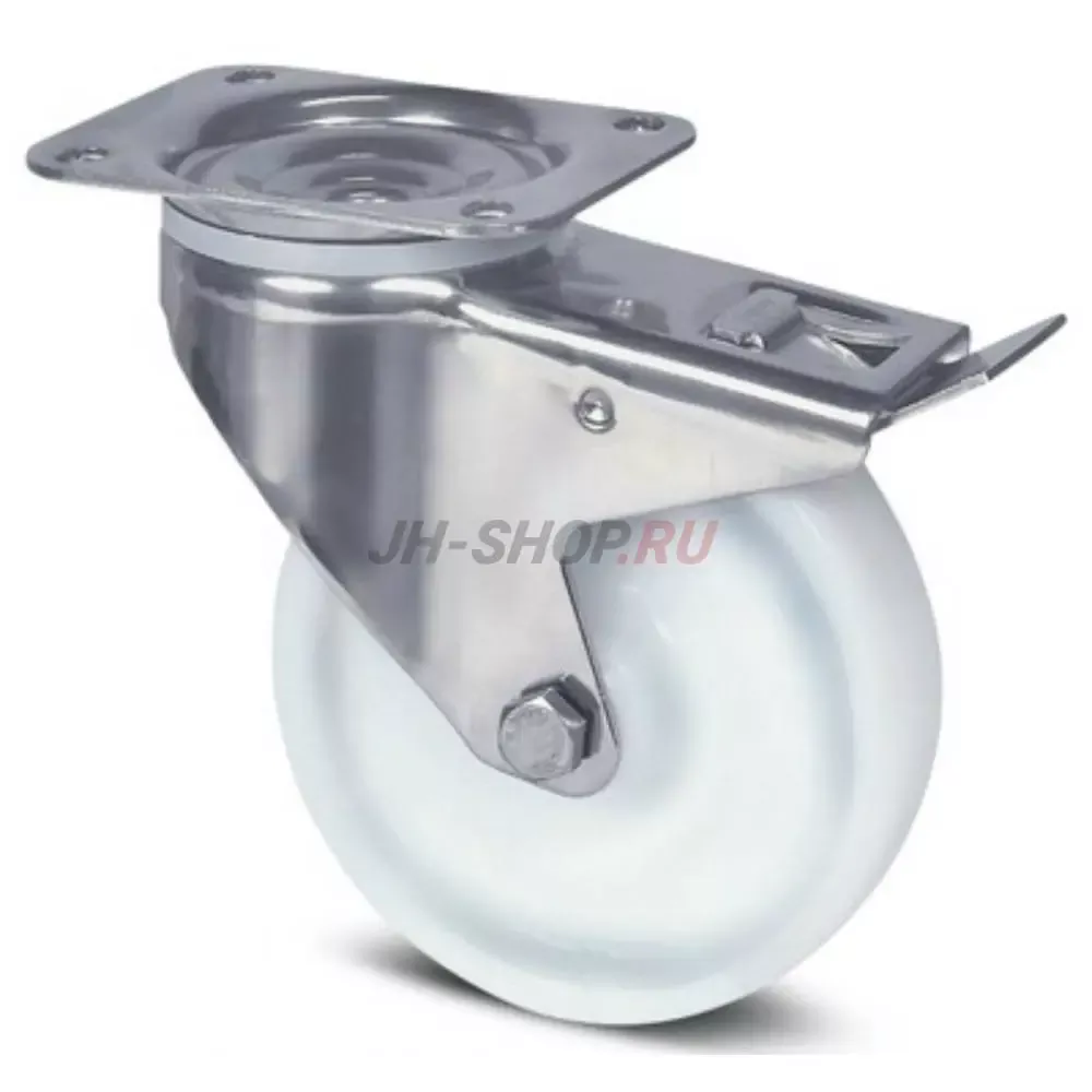 Поворотный ролик с общим тормозом "позадиидущий", кронштейн изготовлен из Нержавеющей Стали, поворотная головка на двойном шарикоподшипнике, ось колеса на болту, крепежная панель. Центр колеса из Полиамида, подшипник скольжения.