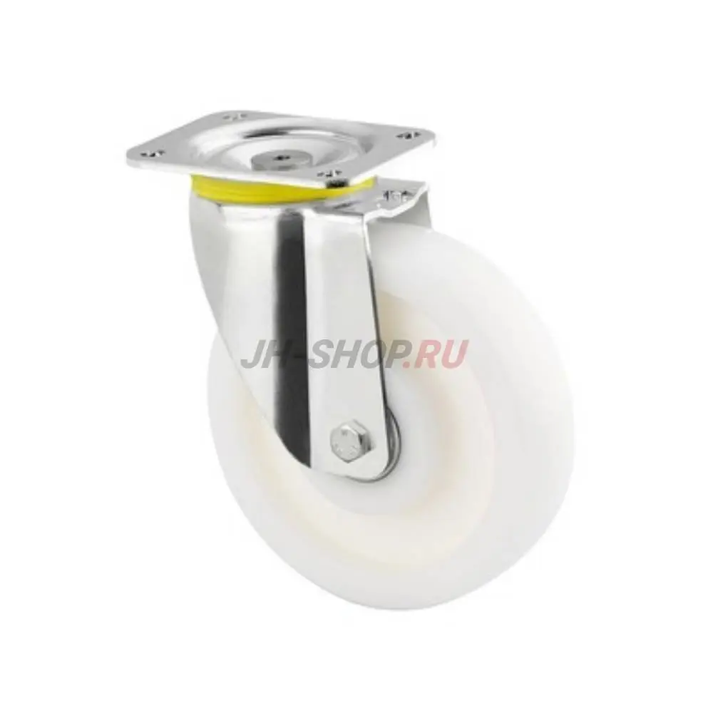 Поворотный ролик, кронштейн из прочной стали, усиленный, оцинкованное пассивированное голубым покрытие, поворотный узел на двойном усиленном герметизированном шарикоподшипнике, скрепленным заклепкой, пылезащитное кольцо с интегрированным ниппелем для смазки, ось колеса на болту с гайкой, крепежная панель. Центр колеса из Полиамида, для тяжелых условий эксплуатации, прецизионный шарикоподшипник.