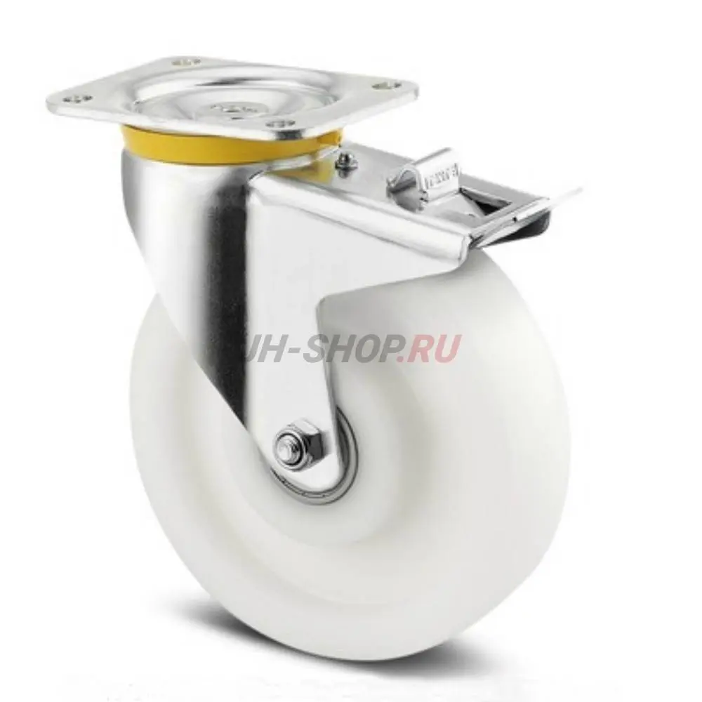 Поворотный ролик с общим тормозом "позадиидущий", кронштейн из прочной стали, усиленный, оцинкованное пассивированное голубым покрытие, поворотный узел на двойном усиленном герметизированном шарикоподшипнике, скрепленным заклепкой, пылезащитное кольцо с интегрированным ниппелем для смазки, ось колеса на болту с гайкой, крепежная панель. Центр колеса из Полиамида, для тяжелых условий эксплуатации, прецизионный шарикоподшипник.