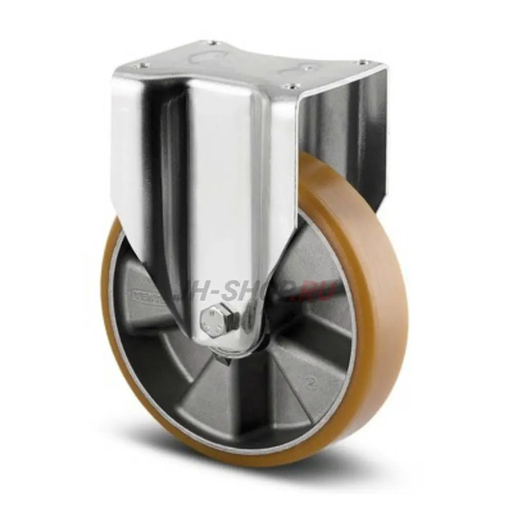 Неповоротный ролик, вилка изготовлена из прочной прессованной стали, усиленная, блестящее оцинкованное пассивированное голубым покрытие, ось колеса на болту, крепежная панель. Центр колеса из Алюминия, протектор: полиуретан, литой, прецизионный шарикоподшипник.