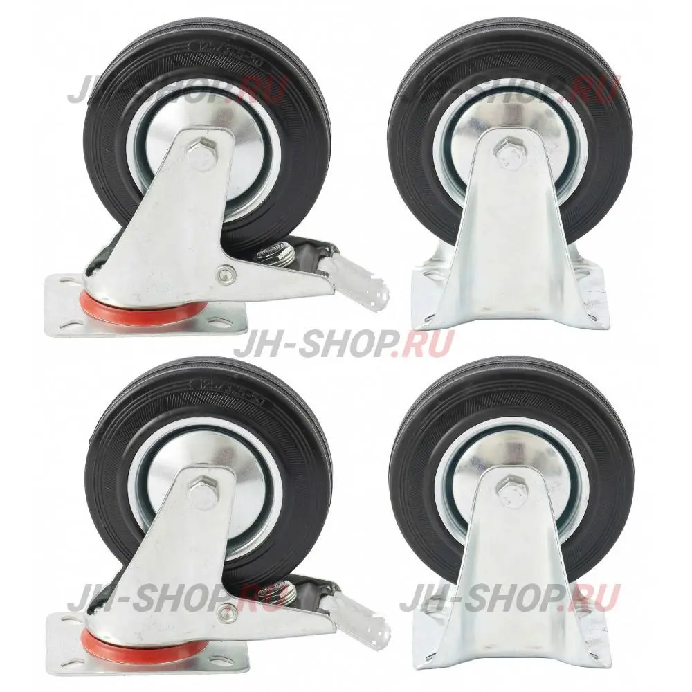 В комплект поставки входит: два неповоротных колеса и два поворотных с тормозом