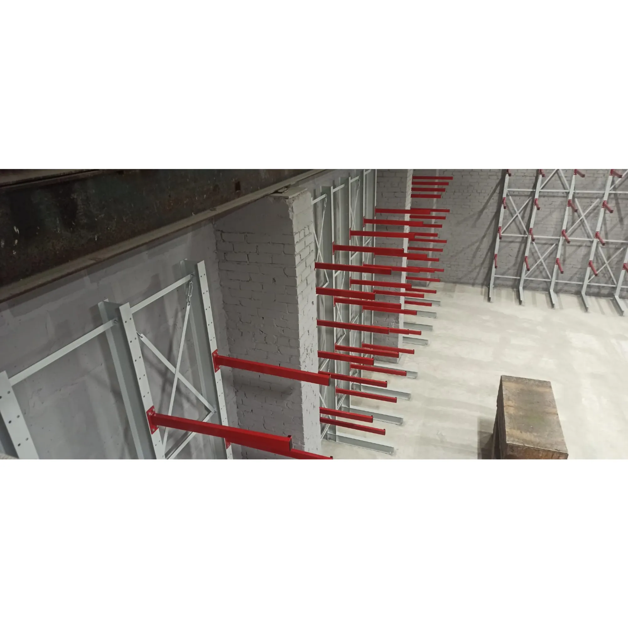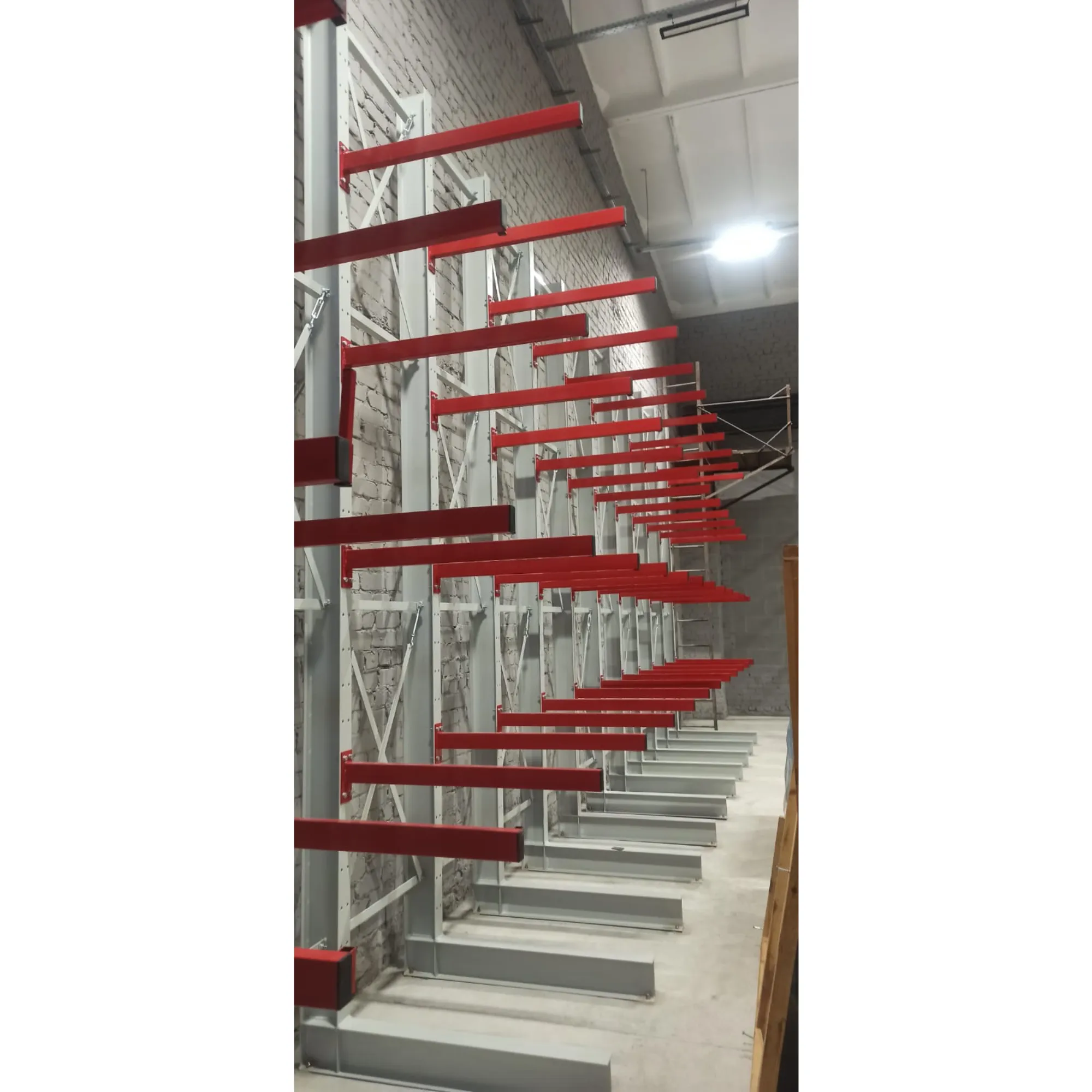 Односторонние консольные стеллажи подходят для повышенных нагрузках, их устанавливают вплотную к стенам.