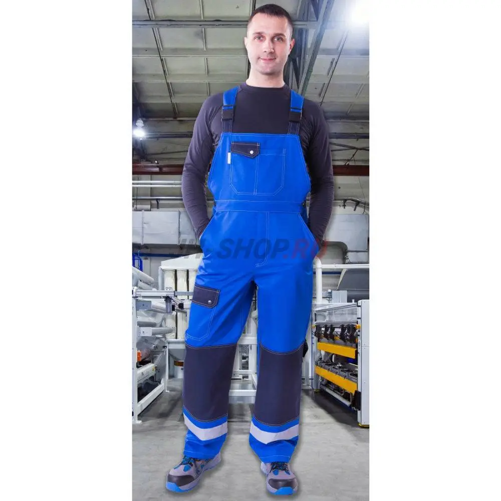 Полукомбинезон прямого силуэта с боковой застежкой на пуговицы, с накладными карманами, с наколенниками, защищающими от истирания. По талии объем регулируется с помощью эластичной тесьмы. СВ лента на кокетках куртки, по низу рукавов и брючин полукомбинезона способствует повышенной видимости. Цвет: васильковый с темно-синим. Ткань: 50 % полиэфир, 50 % хлопок, 214 г/м².