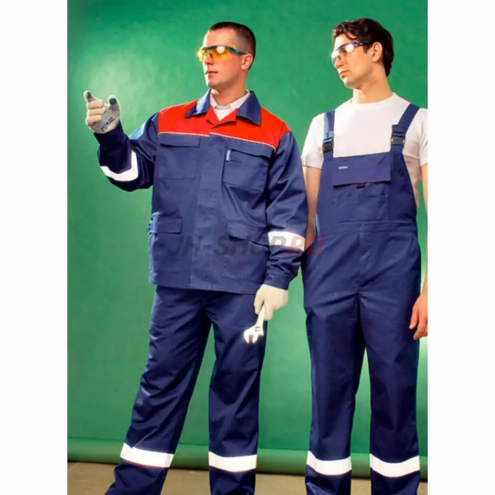 Рукава с манжетом с застежкой на пуговицу. По низу рукавов настрочена световозвращающая лента шириной 50 мм. Полукомбинезон прямого силуэта, с центральной застежкой и боковой застежкой в правом боковом шве на пуговицы, с бретелями, длина бретелей регулируется пряжками-замками и эластичной тесьмой. На грудке полукомбинезона накладной карман с клапаном, застегивающийся на контактную ленту. На карман грудки настрочен малый карман.