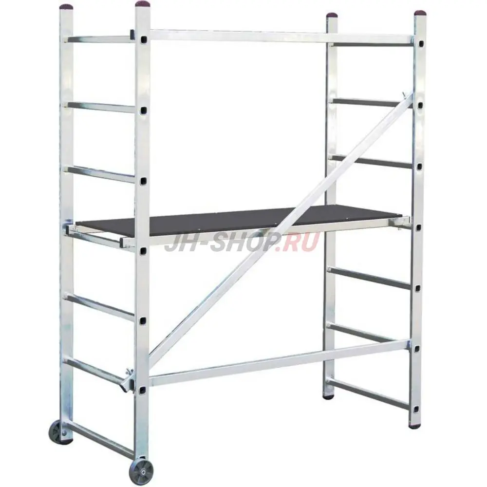 Конструкция передвижной подмости из алюминия гарантирует ее надежность. Строительная вышка-тура состоит из базового блока, куда устанавливаются рамы секции, соединенные между собой гантелями и стяжками крепления. Затем устанавливаются рамы ограждения и настилы. Для большей надежности и устойчивости у основания вышки-туры имеется стабилизатор, обеспечивающий безопасность людей при проведении работ на большой высоте.
