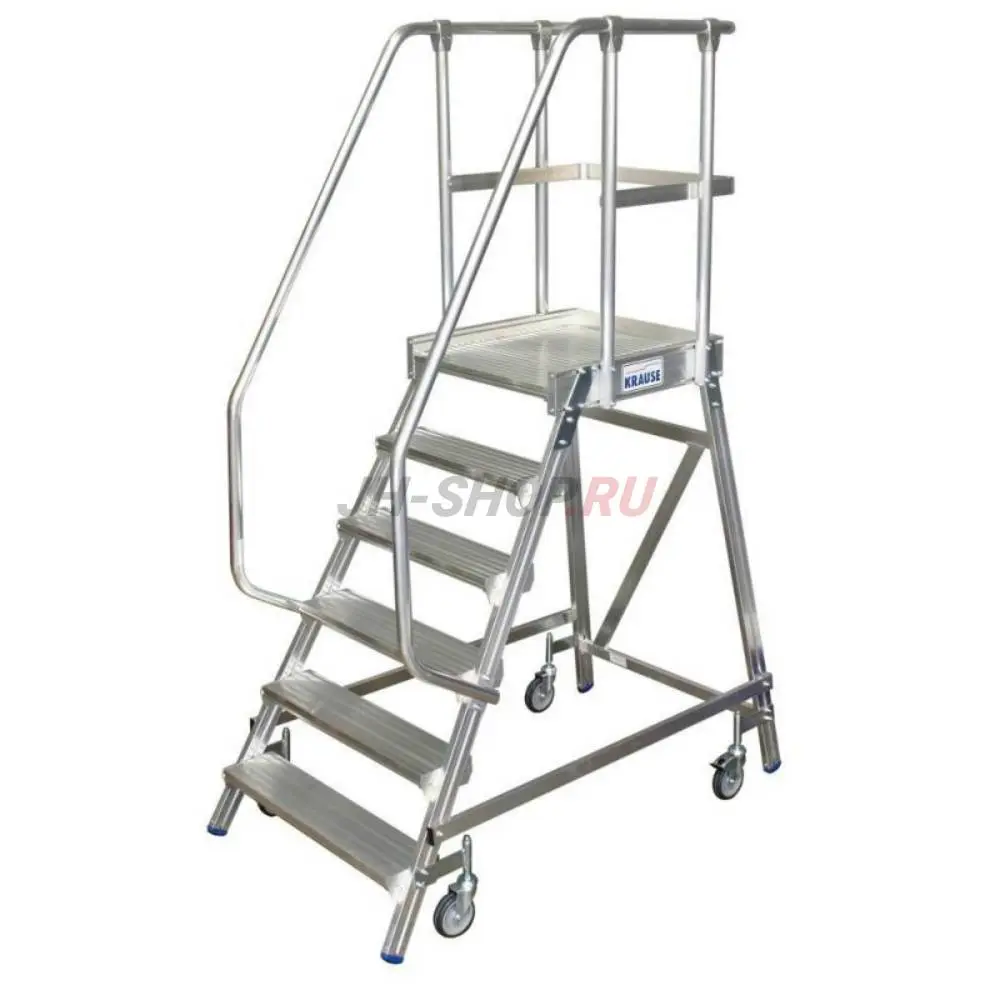 Лестница имеет широкую противоскользящую рабочую площадку и ступени с рифленой поверхностью, благодаря чему подъем и спуск максимально безопасен. С трех сторон платформа имеет стойкие к коррозии перила со встроенной защитной планкой на уровне колен. Стыки между поручнями и перилами плотно прилегают друг к другу, что повышает безопасность проведения высотных работ. Лестничная конструкция оснащена 4 самостопорящимися роликами, 2 из которых имеют фиксаторы. Это облегчает передвижение лестницы с места на место.