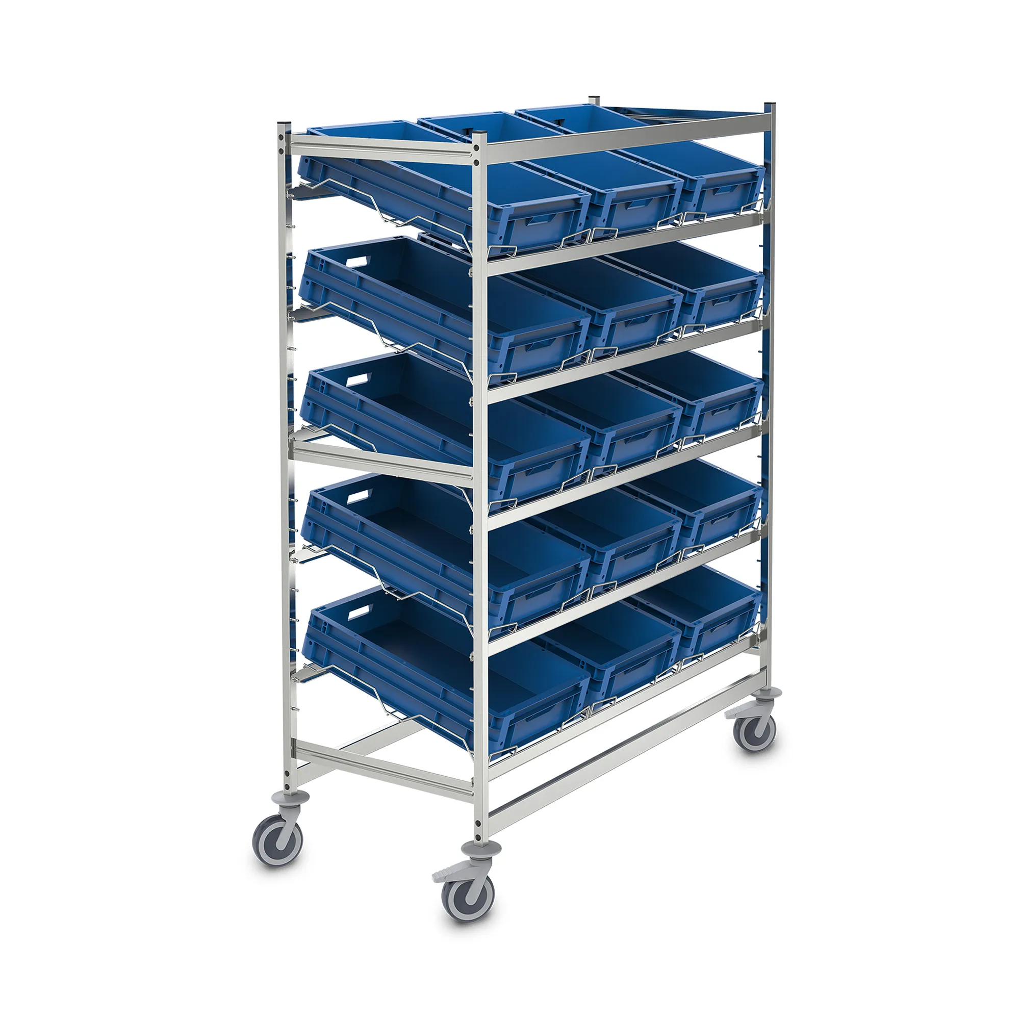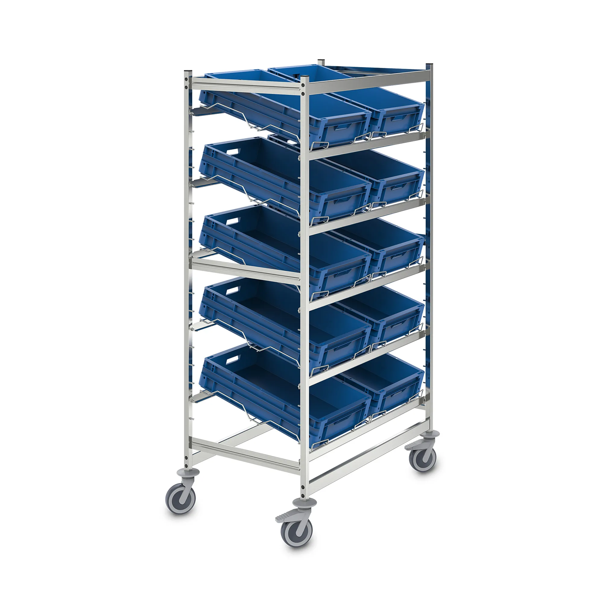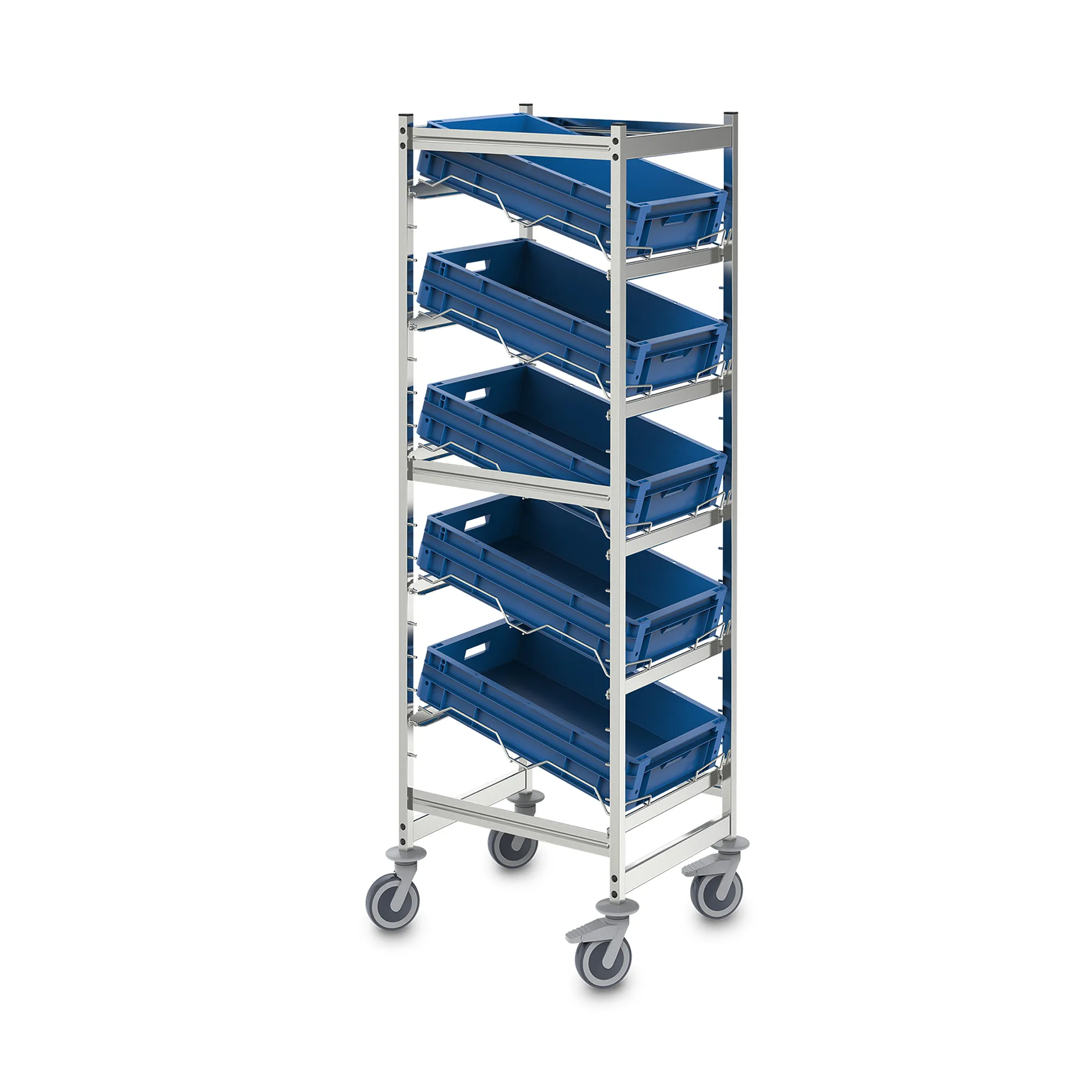 Мобильный стеллаж из нержавеющей стали в гигиеничном исполнении (DIN 18868-2) предназначен для транспортировки и временного хранения товаров в контейнерах типа Euro.