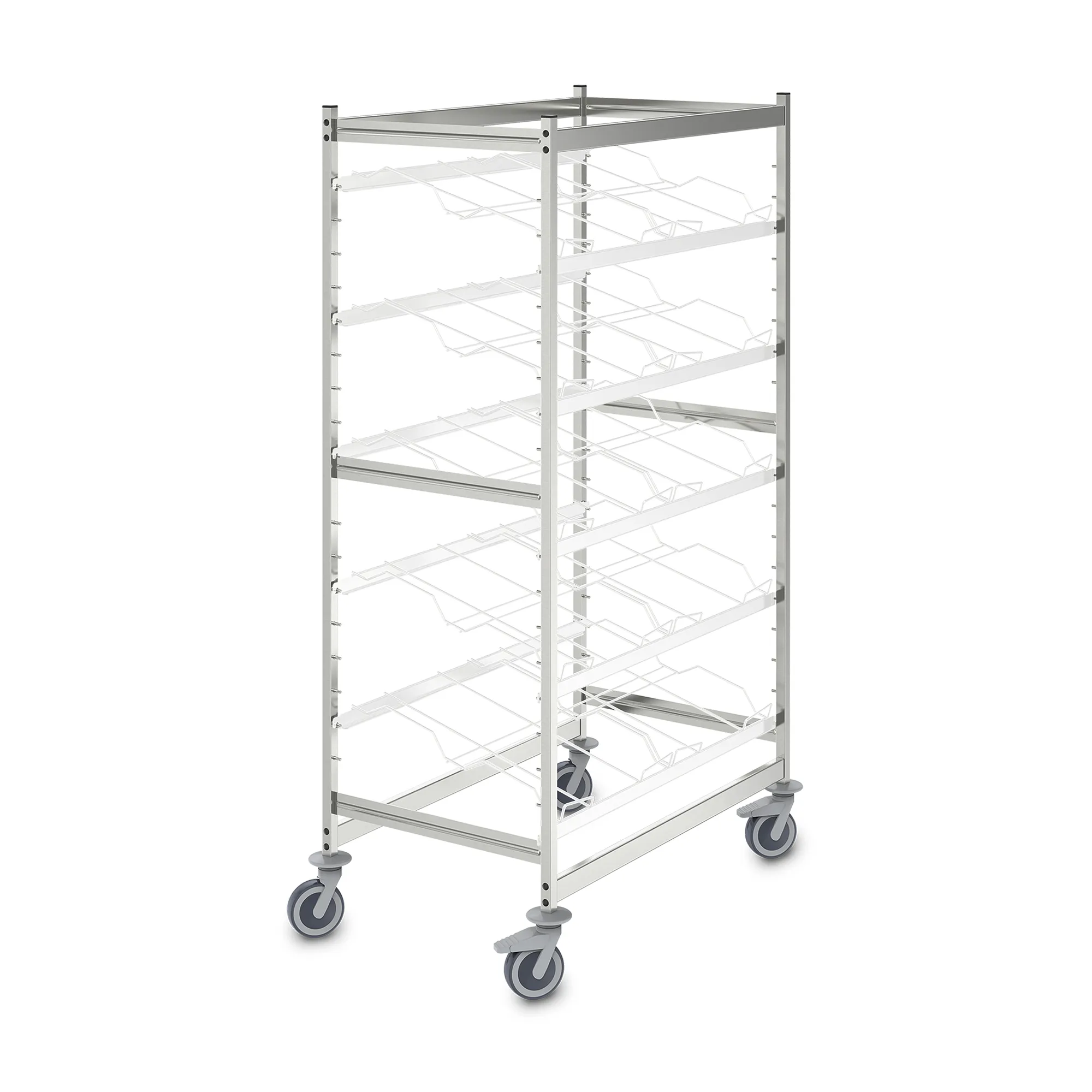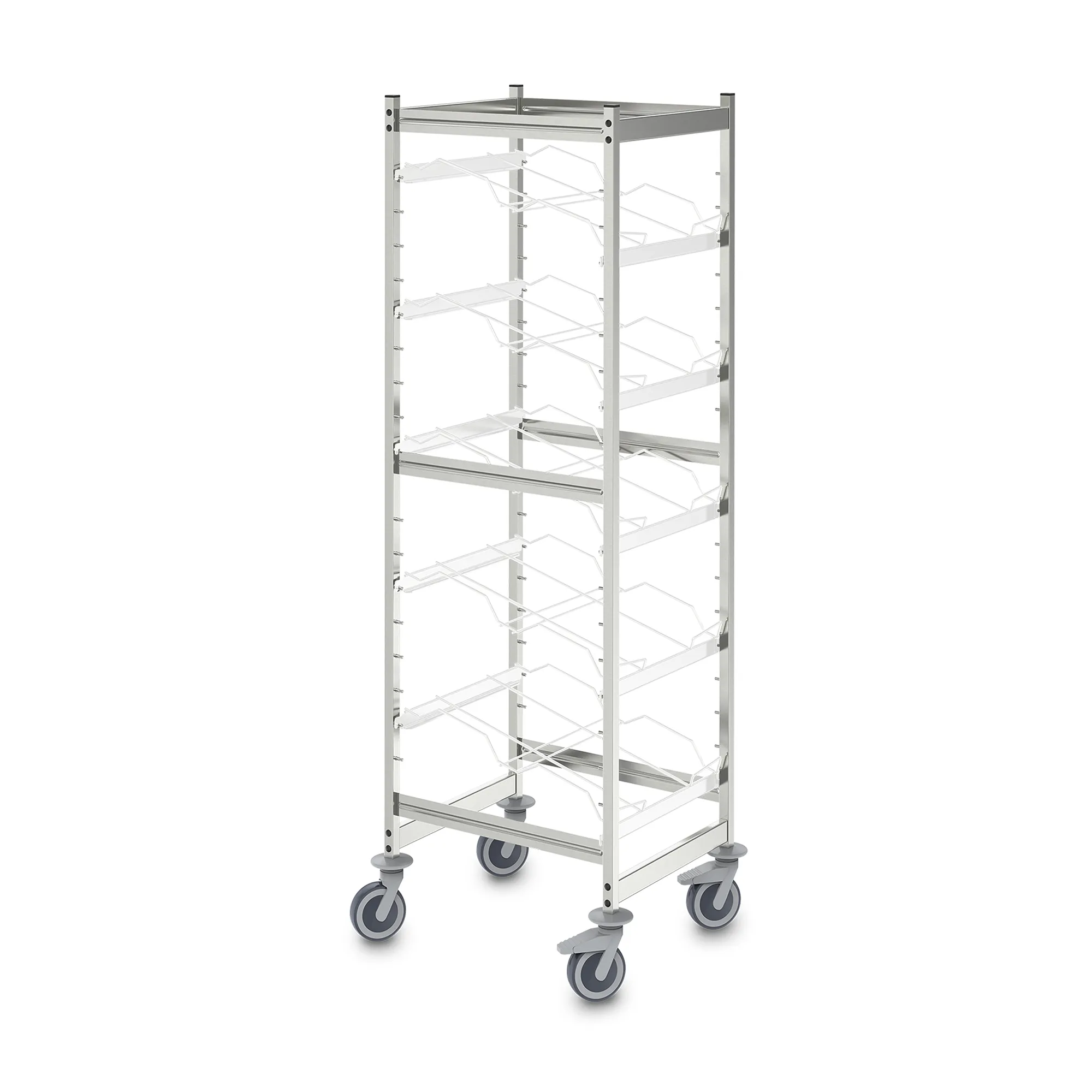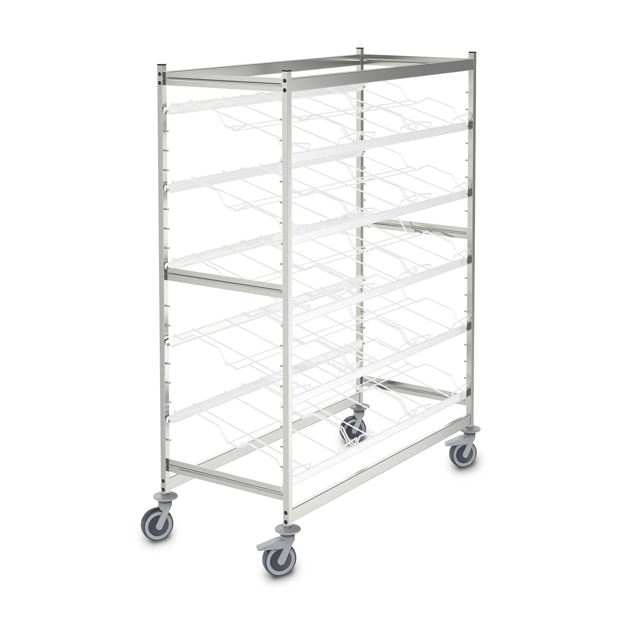 Мобильный стеллаж из нержавеющей стали в гигиеничном исполнении (DIN 18868-2) предназначен для транспортировки и временного хранения товаров в контейнерах типа Euro.