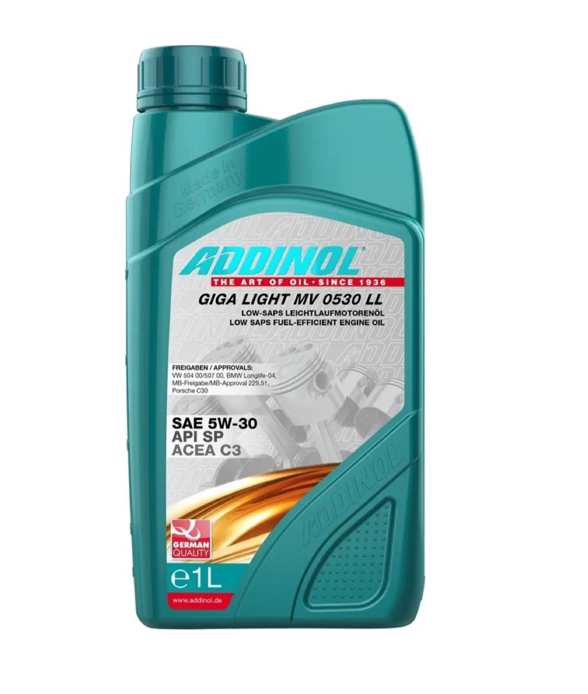 ADDINOL Giga Light MV 0530 LL — это высокомощное моторное масло класса SAE 5W-30 с топливосберегающими свойствами. Оптимальное сочетание самой современной технологии синтеза и инновационных среднезольных (mid SAPS) присадок гарантирует исключительную мощность со свойствами Longlife III.