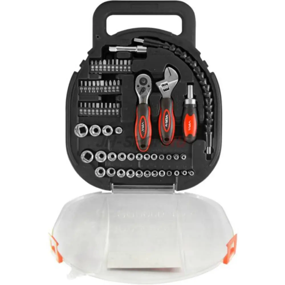 Набор инструментов, головок и бит VIRA 64 предмета. Предназначен для монтажа болтов, гаек, закручивания винтов и саморезов. Биты выполнены из хром-ванадия: хром - один из самых твердых чистых металлов на планете - 68 HRC, а добавление ванадия вносит необходимую пластичность стали, снижает её хрупкость. Прочие элементы набора выполнены из инструментальной CS стали.