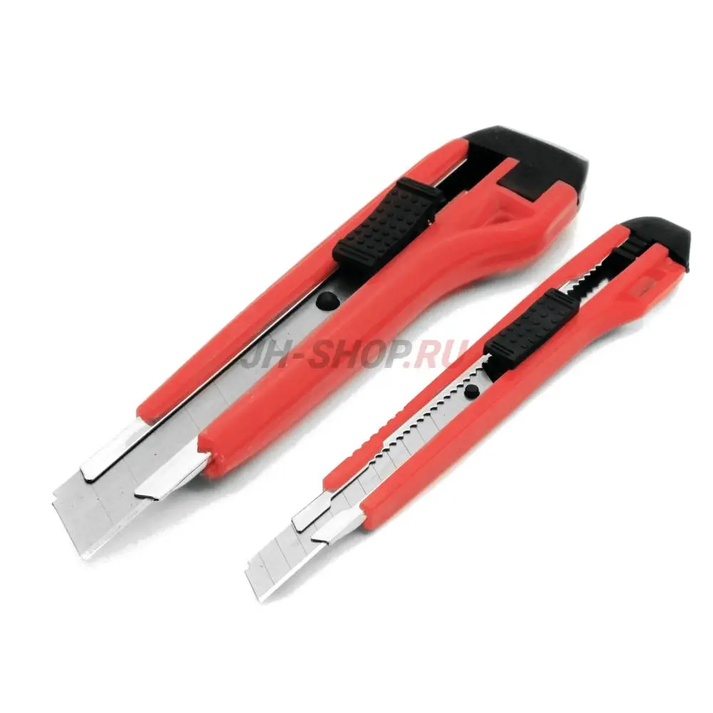 Набор включает в себя два ножа с сегментированными лезвиями: 18 и 9 мм. Первый позволяет разрезать более плотный материал, а второй – делать более точные надрезы. Инструменты предназначены для разрезания бумаги, картона и т.д. Сегментированное лезвие позволяет использовать ножи длительное время – при износе заточки достаточно надломить затупившийся сегмент лезвия и перейти к использованию следующего. Оба инструмента имеют систему фиксации лезвия Auto-lock, что позволяет с помощью автоматического фиксатора отрегулировать длину лезвия и закрепить его положение.