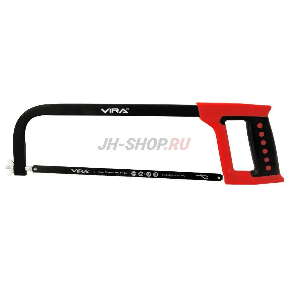 Ножовка по металлу VIRA с двухкомпонентной рукояткой. Ножовка по металлу VIRA с двухкомпонентной рукояткой. Инструмент используют для распиливания металлических деталей и заготовок. Корпус ножовки – алюминиевый. Этот материал совмещает в себе необходимую прочность с легкостью - вес инструмента 260 гр. Рукоятка из пластика и резинового покрытия надежно обхватывается и не скользит в ладони, не режет её.