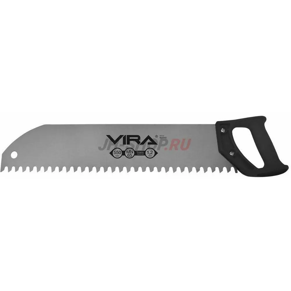 Ножовка по пенобетону VIRA 550 мм. Инструмент предназначен для распиливания строительных блоков из пенобетона. Для полотна ножовки используется сталь Mn65 с твердостью 50-56 HRC. Этот материал обладает повышенной стойкостью к износу – из него производят корпусы подшипников, фрикционные диски машин.