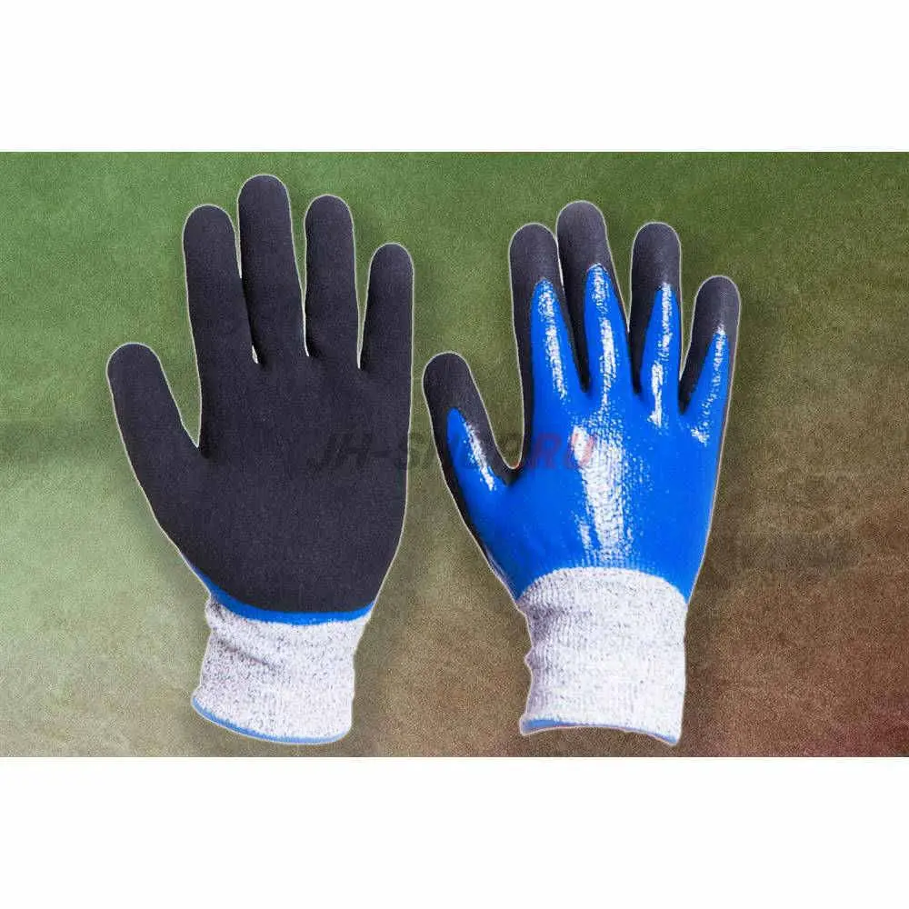 Перчатки с антипорезной основой CUT-5 13 класса вязки. Состав основы - спандекс, полиэтилен высокой плотности, нейлон, файберглас. Полное нитриловое покрытие, на ладонной части вспененный нитрил.