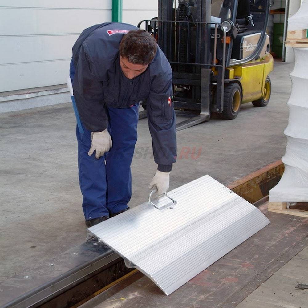 Произведен из прессованного специального сплава, поверхность которого защищена от соскальзывания. Стальная направляющая шина приваривается к краю рампы. В собранном виде мост располагается вертикально по канту рампы.