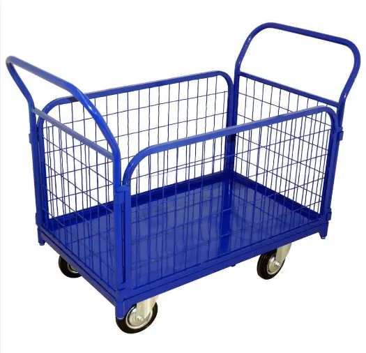 Тележка металлическая платформенная с быстро съемными сетчатыми бортами (ТС) для транспортировки всевозможных товаров и грузов. Высокие борта (500 мм.) и наличие двух ручек удобна в эксплуатации в ограниченном пространстве и узких проходах. Заполнение бортов и ручек - сетка с ячейкой 100х50 мм. Сетка изготовлена на высокоточном сварочном оборудовании.
