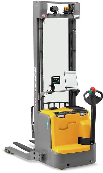 Например: Штабелер электрический самоходный Jungheinrich EJC M10 h3, 3300 мм (имеет высоту от пола до верхней поверхности вил 3300мм).