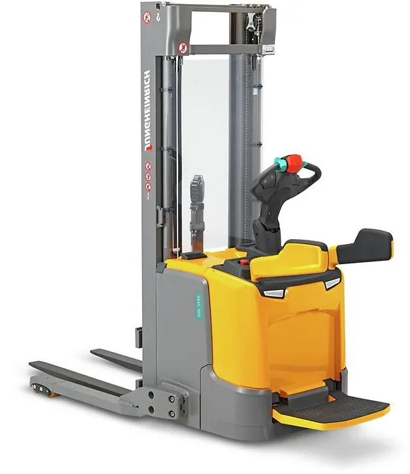 Электрический самоходный штабелер подходит для того, чтобы перевозить грузы на небольшие расстояния, поднимать и устанавливать их на стеллажи.