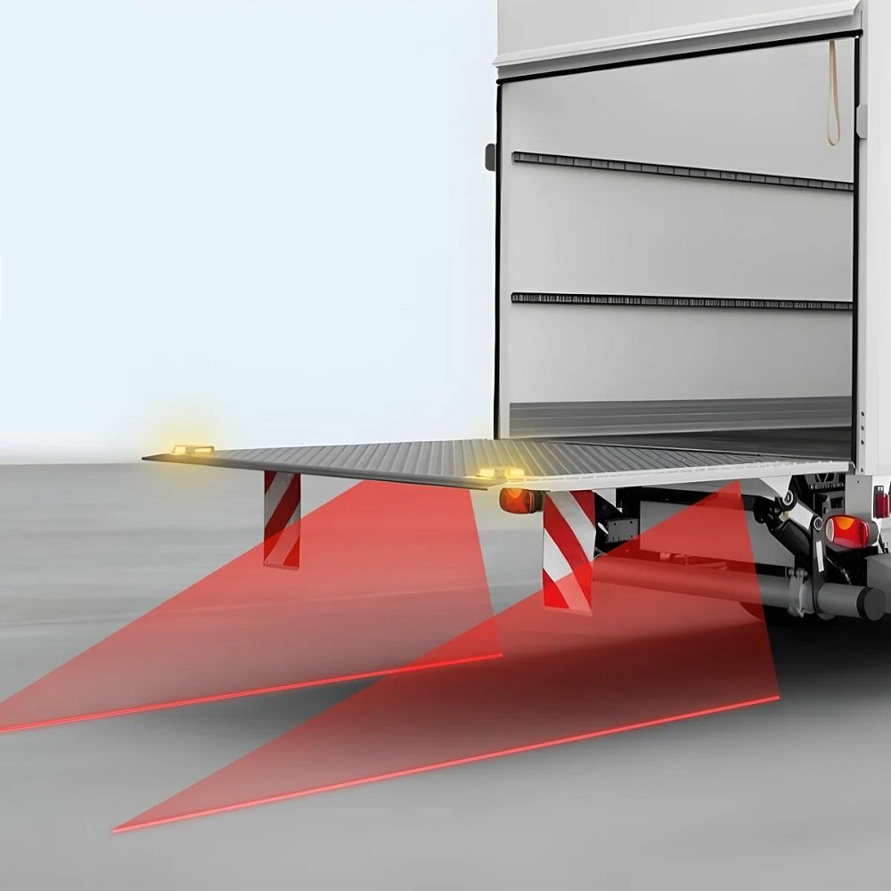 Система осуществляет световое сопровождение поднимания и опускания гидроборта для целей осуществления безопасности остальных участников движения на складах, местах разгрузки (погрузки). При опускании борта ниже 60 градусов относительно поверхности дорожного полотна система активируется и включает 2 ярких стробоскопических лампы, находящиеся на верхней поверхности и 2 красных сигнальных лампы на нижней поверхности для формирования световых границ опускания борта на поверхности дороги.