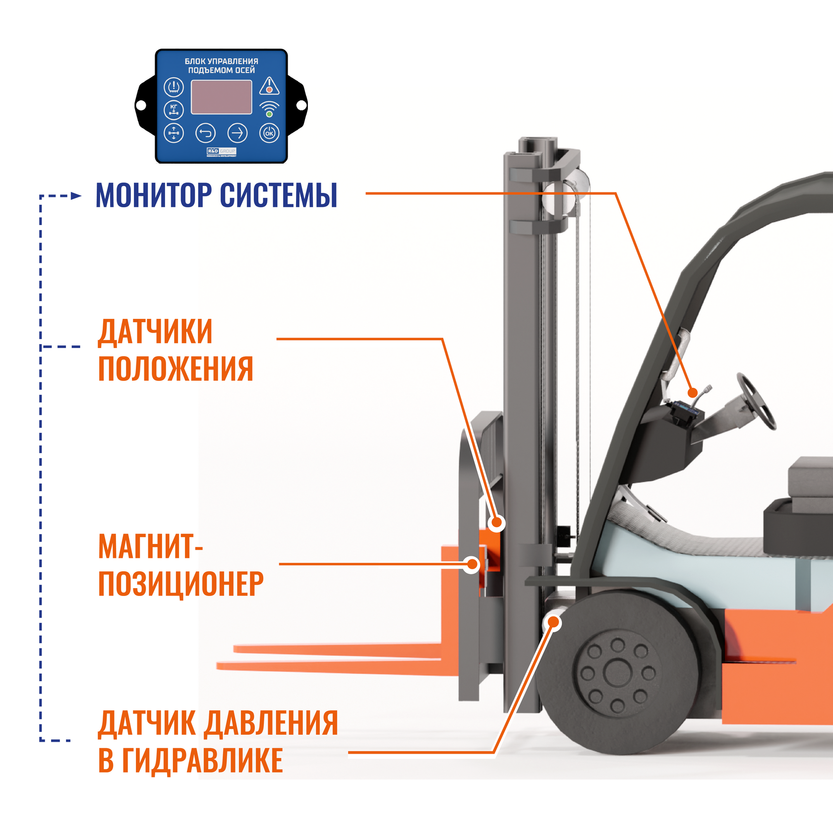 Комплект предназначен для интеграции с различными моделями складской техники и позволяет повысить безопасность работы, продлить срок службы оборудования и снизить расходы на ремонт и обслуживание.