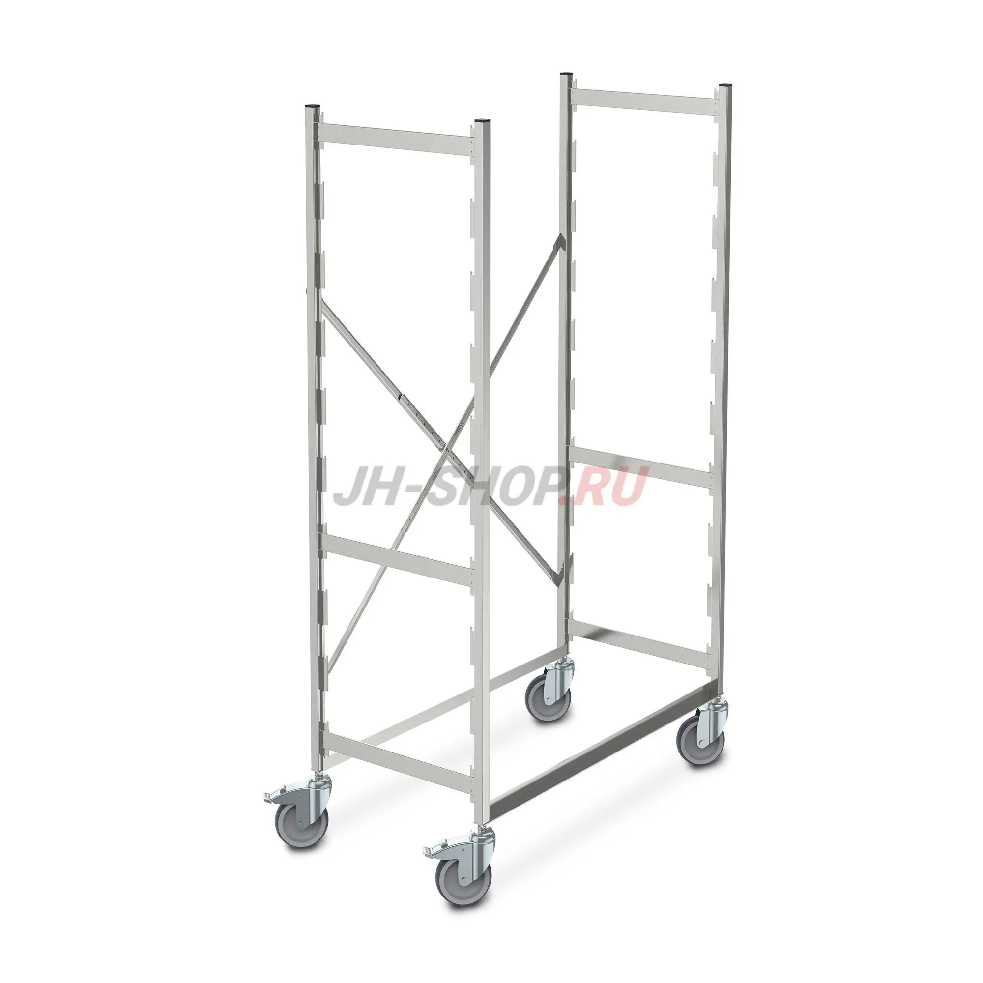 Стойки изготовлены из специальных квадратных трубок размером 1,0 х 1,0 '' (25 х 25 мм), соединенных и стабилизированных с помощью нажимных спиц 1,6 х 0,28 '' (40 х 7 мм), расположенных поперек. Верхние покрывающие колпачки изготовлены из пластика, а гигиенические окончания - вертикальные. Сварные полки на расстоянии 5,9 '' (150 мм) для удобного крепления полки. Полки в гигиеническом исполнении для легкой очистки.