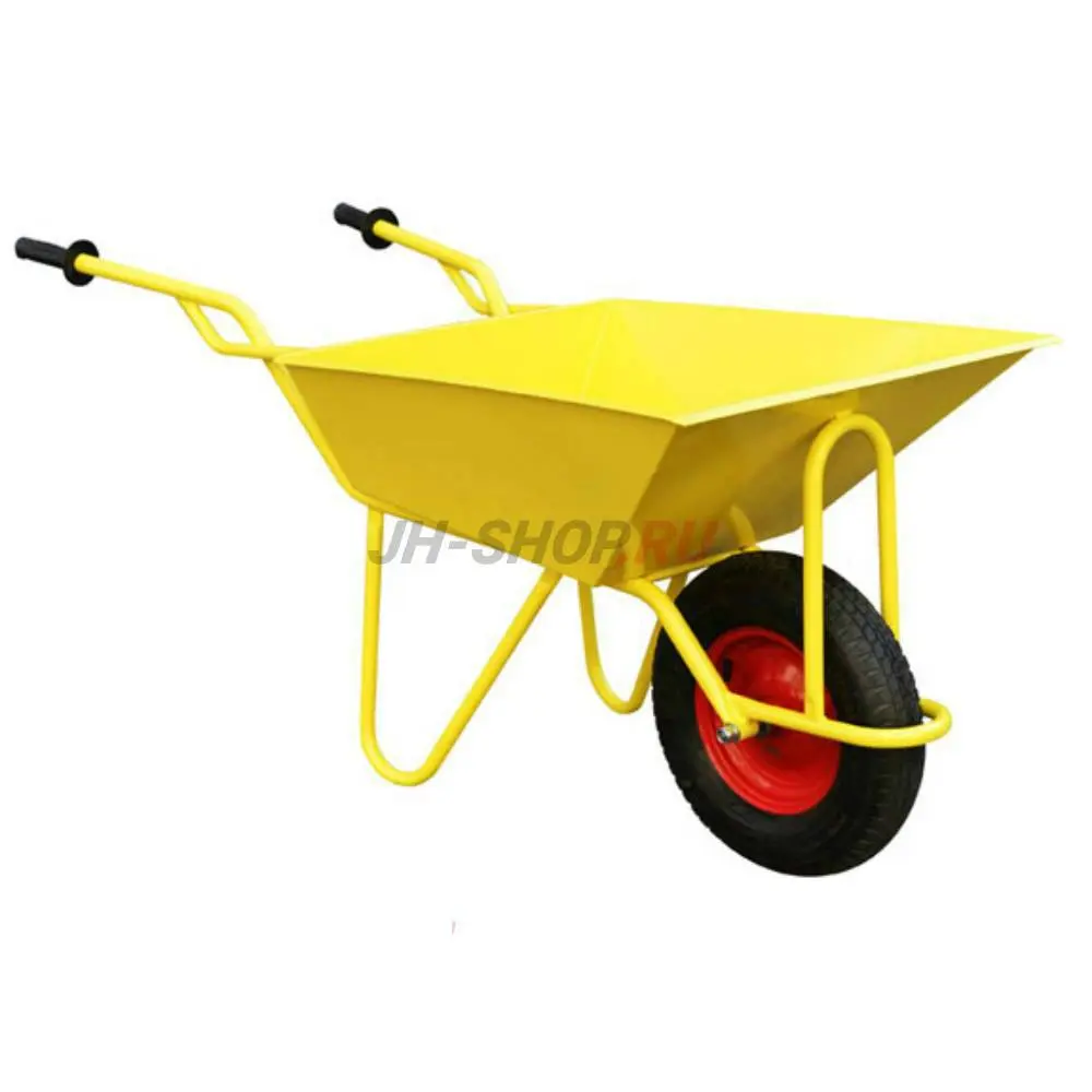 Тачка сварная, не разборная. Каркас, изготовленный из стальной трубы, своей геометрией усиливает кузов по всей поверхности, позволяя достичь максимальной надежности тачки при эксплуатации. Конструкция ручек и расположение центра тяжести минимизирует нагрузку на руки при использовании тачки.