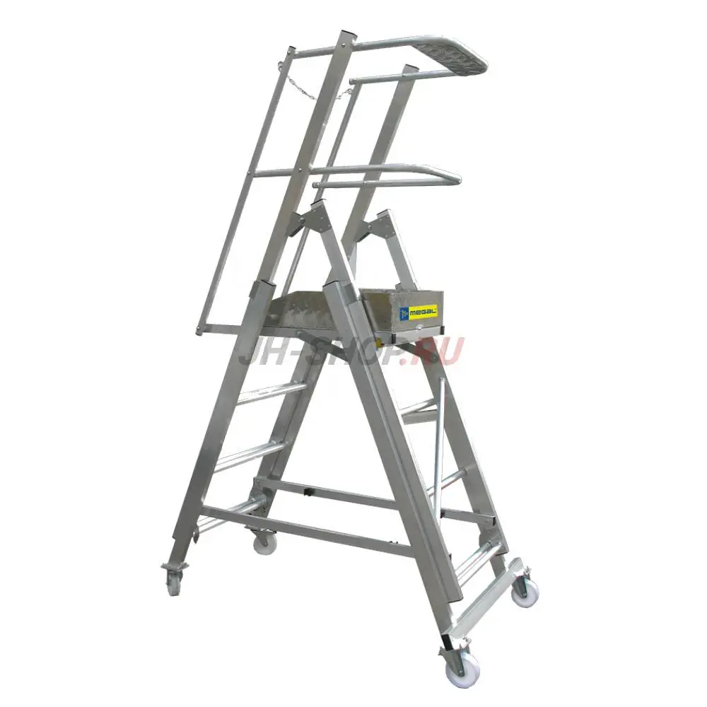 - Нижние концы лестницы с платформой оборудованы колесами поворотными с фиксатором.