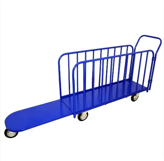 Тележка ДЛ предназначена для перемещения длинномерных грузов по узким проходам. Наличие усиленных трубчатых бортов, позволяет надежно зафиксировать груз на платформе (например рулон линолиума, обрезную доску и т.д.).