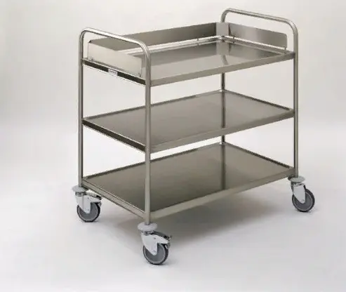 Тележки для сбора посуды изготовлены из высококачественной нержавеющей стали. Прочная конструкция из двух стальных труб с ручками, Ø 25 мм, с приваренными штампованными полками с фланцами по периметру.