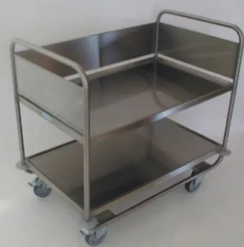 У верхней полки край на 90 мм выше поверхности, а у нижней полки на 100 мм выше поверхности. Это гарантирует, что почти вся площадь полки может быть использована для хранения различных небольших и легких предметов, так как края эффективно защитят от падения, когда тележка перемещается по неровной поверхности даже с максимальной загрузкой. Бортик изготовлен из прочной нержавеющей листовой стали толщиной 1,5 мм и жёстко связан с краями полок.