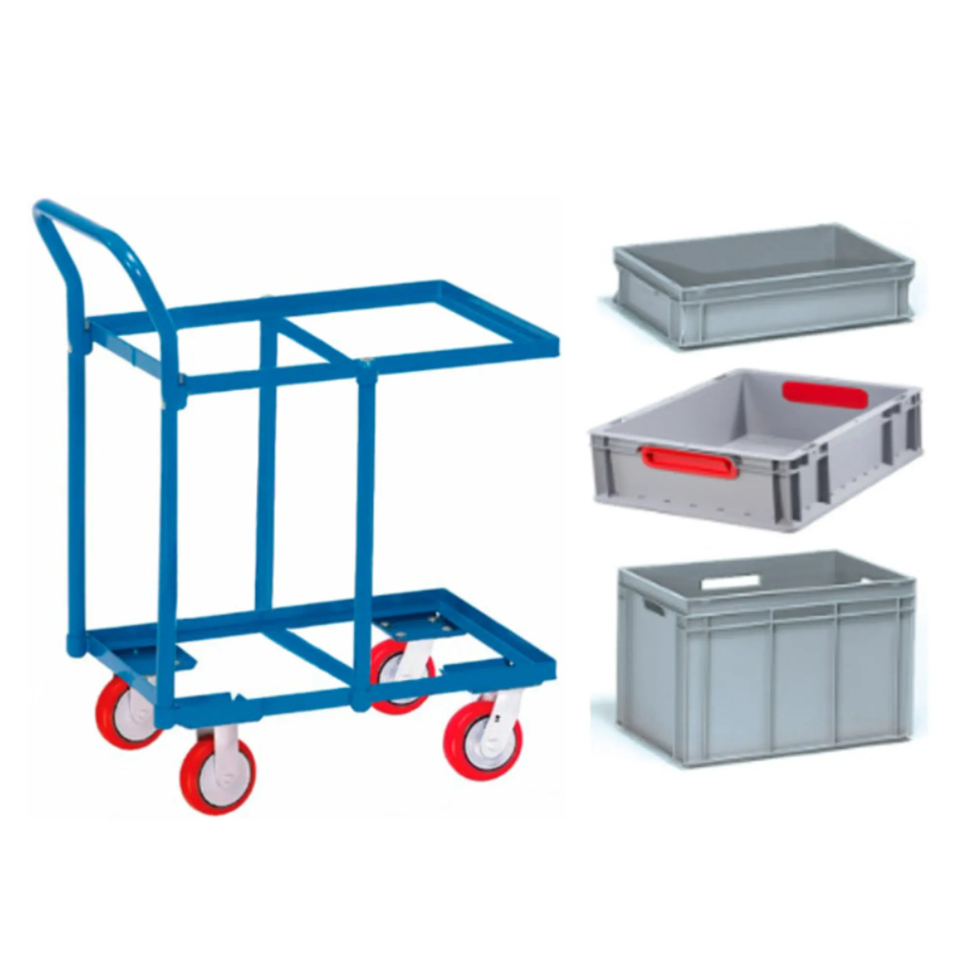 Тележка легка и проста в применении. Идеально подходит для перевозки евробоксов, ящиков, коробов или лотков на складах, в торговых залах, на производстве. Предназначена для регулярного, интенсивного использования.