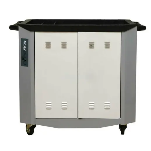 Тележка сформирована на базе металлического корпуса. Внутри корпуса размещены две полки которые разделены перфорированной перегородкой на четыре отделения. Два отделения снабжены сетчатыми перегородками и предназначены для хранения ноутбуков. Сетчатые перегородки съемные, позволяющие оптимально организовать внутреннее пространство, при количестве ноутбуков менее 16 штук. Максимальное количество ноутбуков по 8 штук на каждой полке. Внутреннее отделение закрывается двумя дверьми с ригельным замком. В правом отделении тележки располагается полочка для роутера WiFi.