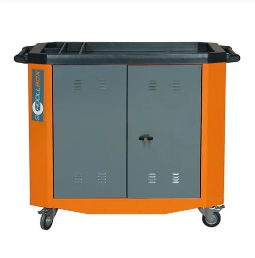 Тележка сформирована на базе металлического корпуса. Внутри корпуса размещены две полки которые снабжены сетчатыми перегородками и предназначены для хранения ноутбуков. Сетчатые перегородки съемные, позволяющие оптимально организовать внутреннее пространство, при количестве ноутбуков менее 30 штук. Максимальное количество ноутбуков по 15 штук на каждой полке. Внутреннее отделение закрывается двумя дверьми с ригельным замком.