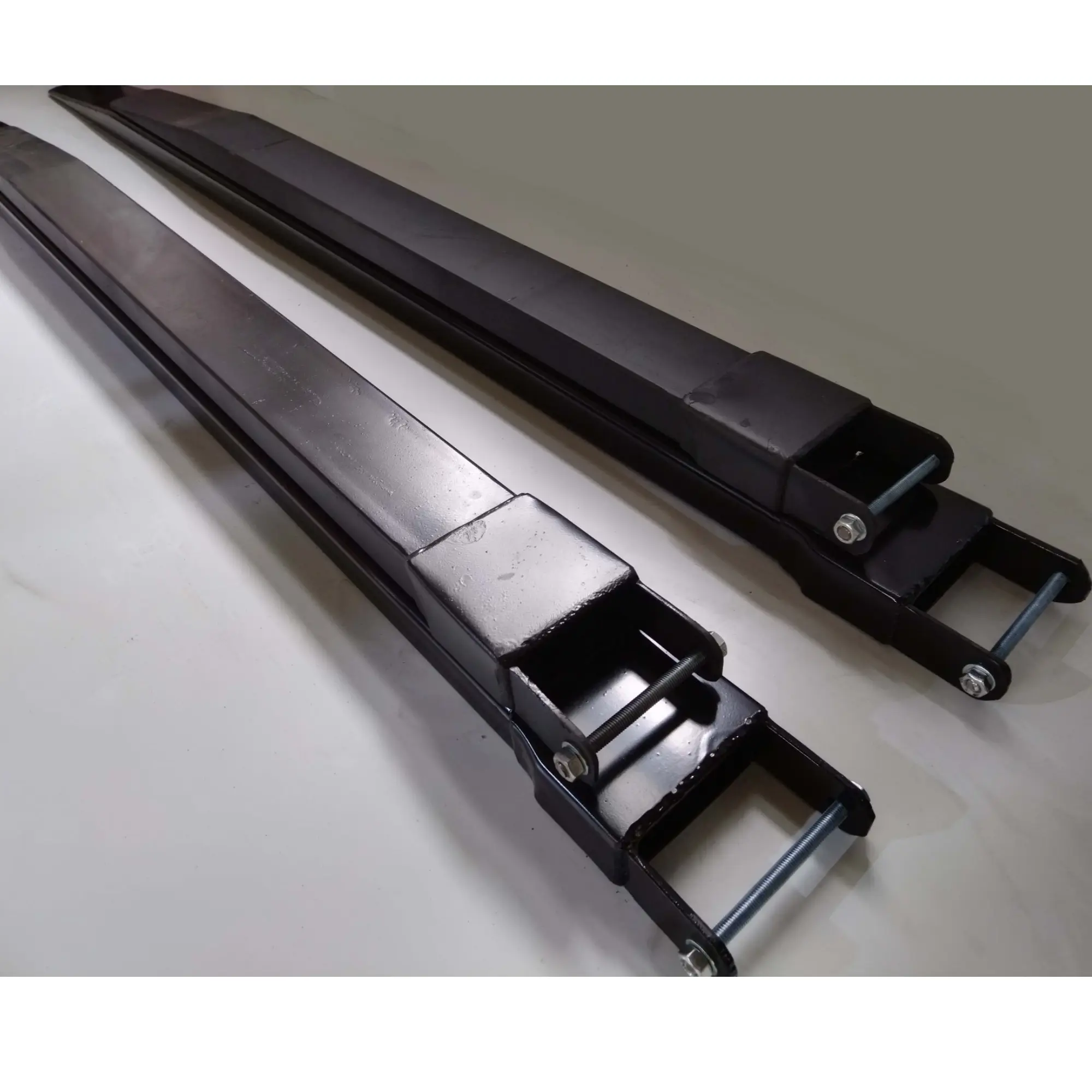 Главное достоинство такого устройства на технику — простота его установки и возможность транспортировки любого по длине груза без его повреждения, что, заметим, часто наблюдается, если применяются короткие вилы при перемещении длинных паллетов. Внимание! Удлинить вилы погрузчика при помощи удлинителя можно не более 40-60% от стандартных вил.