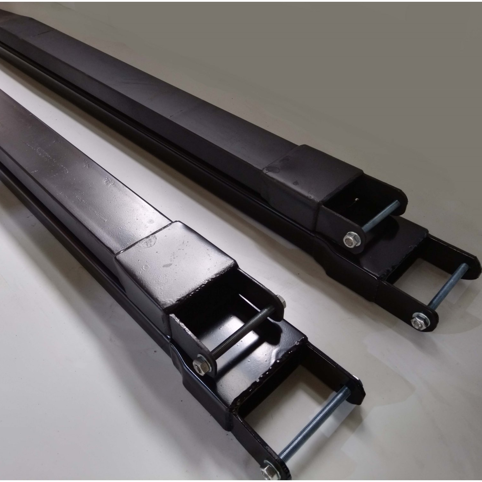 Главное достоинство такого устройства на технику — простота его установки и возможность транспортировки любого по длине груза без его повреждения, что, заметим, часто наблюдается, если применяются короткие вилы при перемещении длинных паллетов. Внимание! Удлинить вилы погрузчика при помощи удлинителя можно не более 40-60% от стандартных вил.