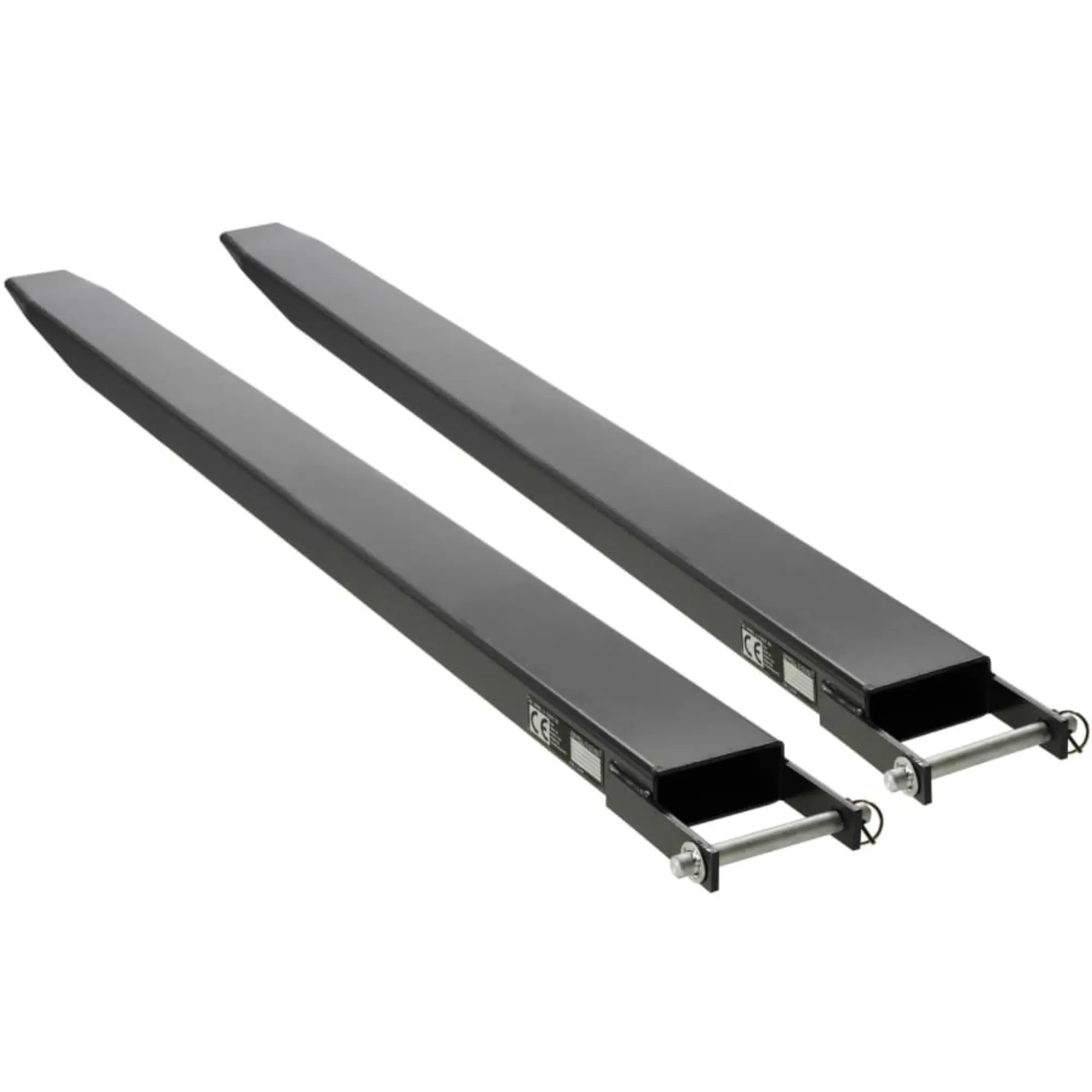 Главное достоинство такого устройства на технику — простота его установки и возможность транспортировки любого по длине груза без его повреждения, что, заметим, часто наблюдается, если применяются короткие вилы при перемещении длинных паллетов. Внимание! Удлинить вилы погрузчика при помощи удлинителя можно не более 40-60% от стандартных вил.